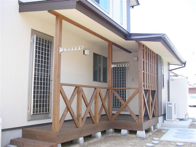最初からウッドデッキを作り込むことで、庇を伸ばしてウッドデッキにも庇を掛けられます。
