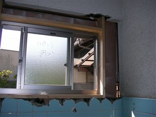 外のサッシとの調整の為、サッシ周りに木枠を入れ調整します。